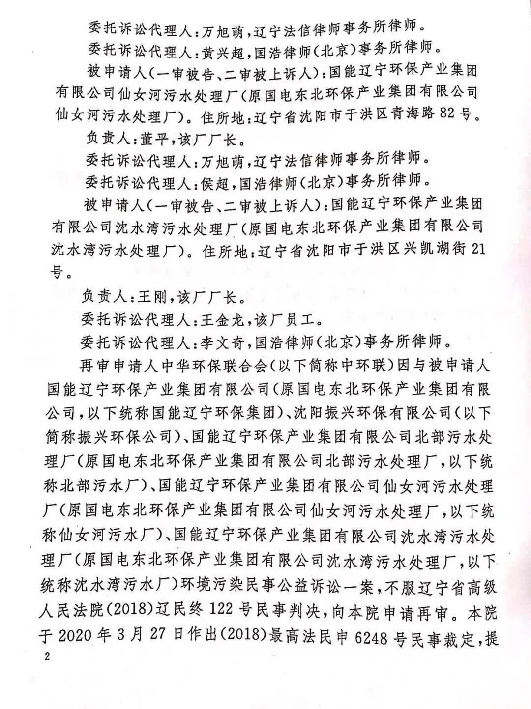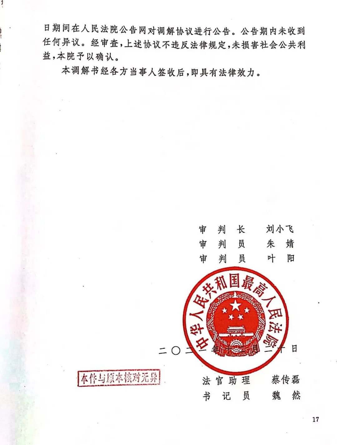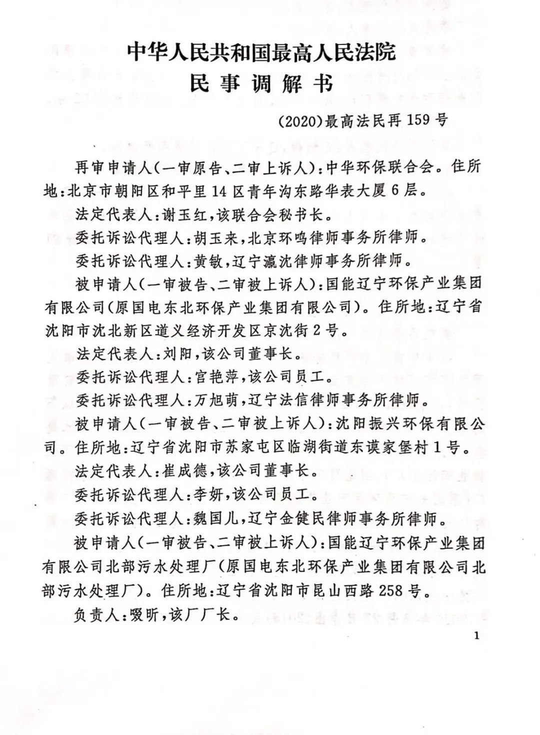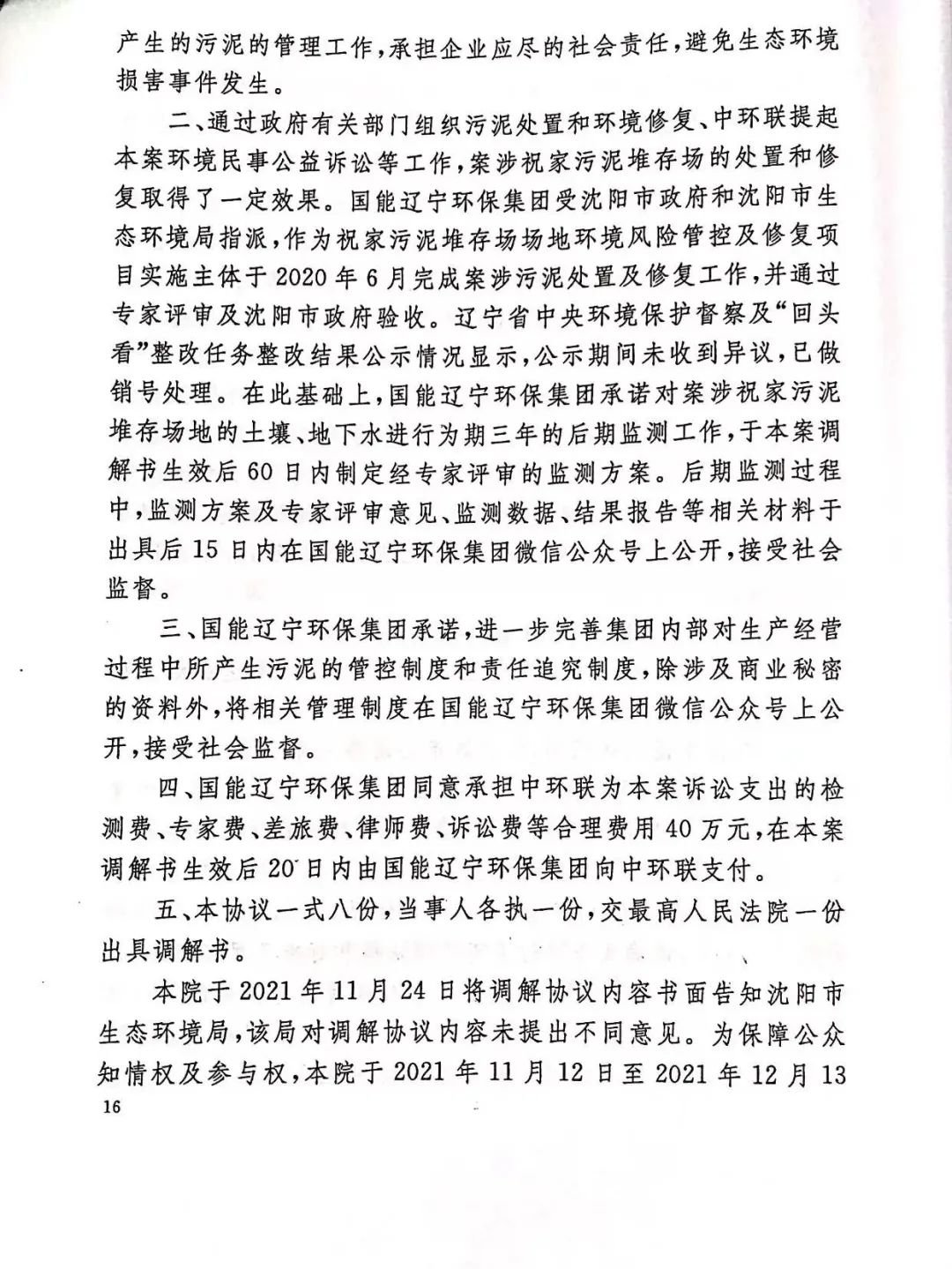 2021年12月20日,由最高人民法院提审的18luck官网app诉国能辽宁环保产业集团有限公司(原国电东北环保产业集团有限公司)等六被告环境污染责任纠纷案(沈阳祝家污泥公益诉讼案),原被告双方达成调解协议,经最高人民法院依法公告30日后,作出了《民事调解书》,现已签收生效。