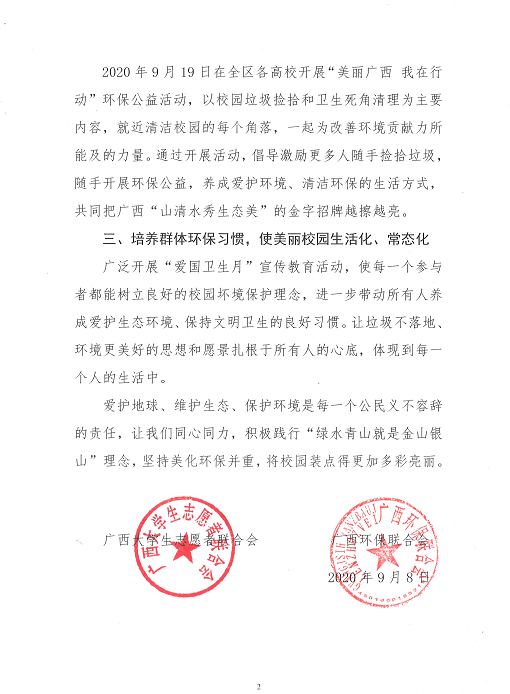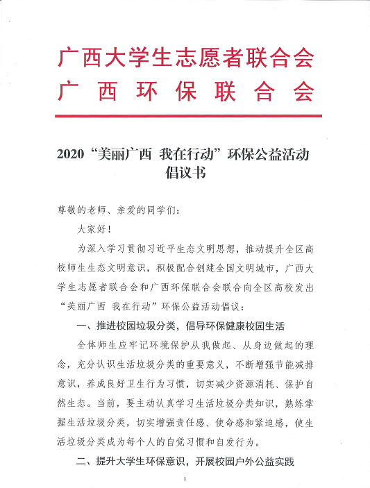 广西环保联合会、广西大学生志愿者联合会共同发起2020“美丽广西 我在行动”环保公益活动倡议书