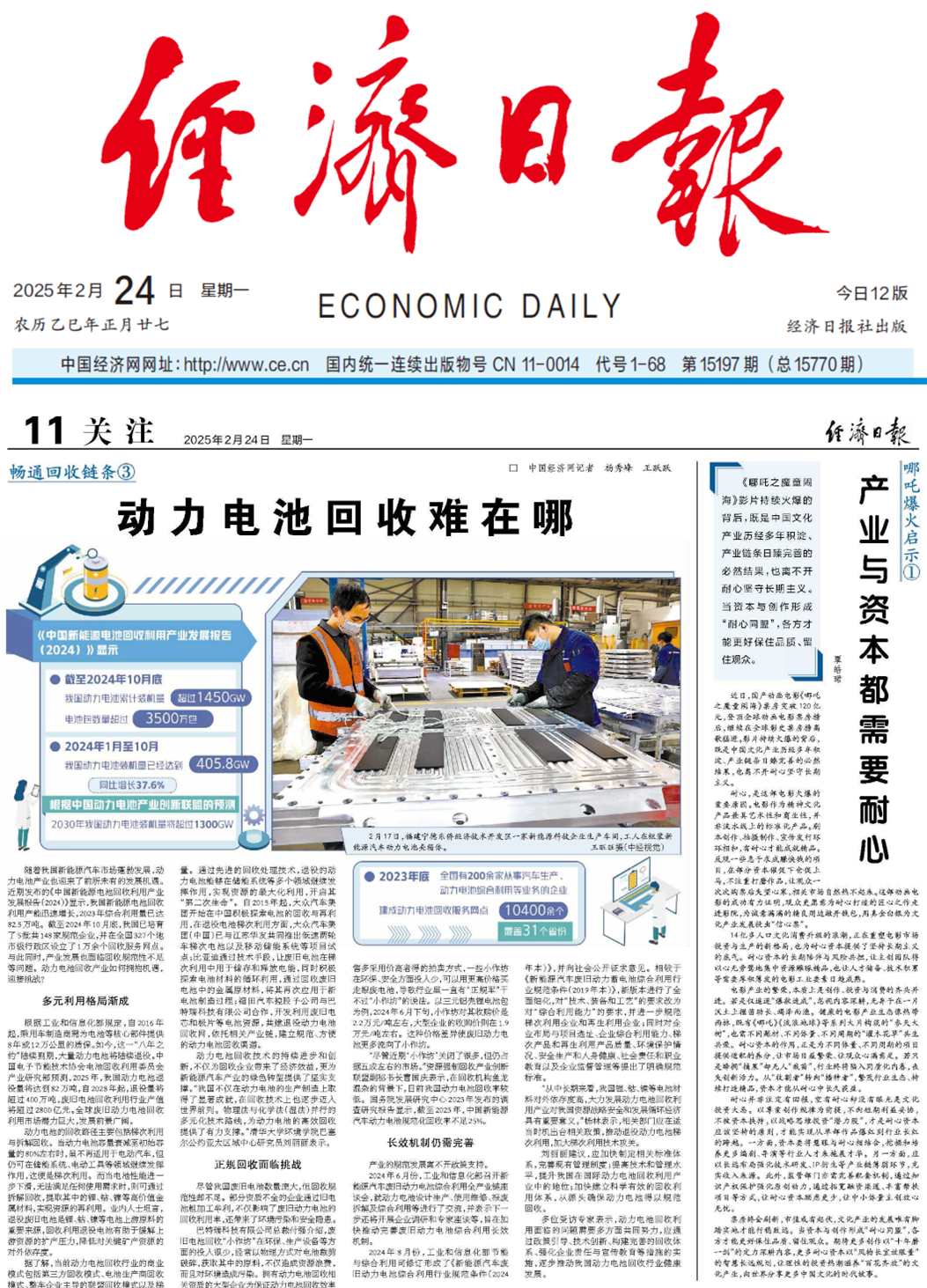 随着我国新能源汽车市场蓬勃发展,动力电池产业也迎来了前所未有的发展机遇。近期发布的《中国新能源电池回收利用产业发展报告(2024)》显示,我国新能源电池回收利用产能迅速增长,2023年综合利用量已达82.5万吨。截至2024年10月底,我国已培育了5批共148家规范企业,并在全国327个地市级行政区设立了1万余个回收服务网点。与此同时,产业发展也面临回收规范性不足等问题。动力电池回收产业如何拥抱机遇,迎接挑战?