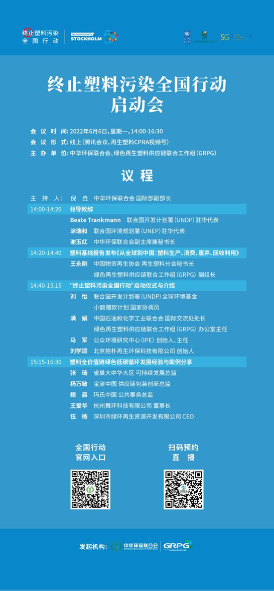 终止塑料污染全国行动(以下简称“全国行动”)将于2022年6月6日正式启动,并于当日下午2点举办线上启动会。本次全国行动由18luck官网app、绿色再生塑料供应链联合工作组发起,联合国开发计划署全球环境基金小额赠款计划支持,定位于动员塑料价值链上的所有利益相关方共同关注塑料污染问题并提出创新解决方案。