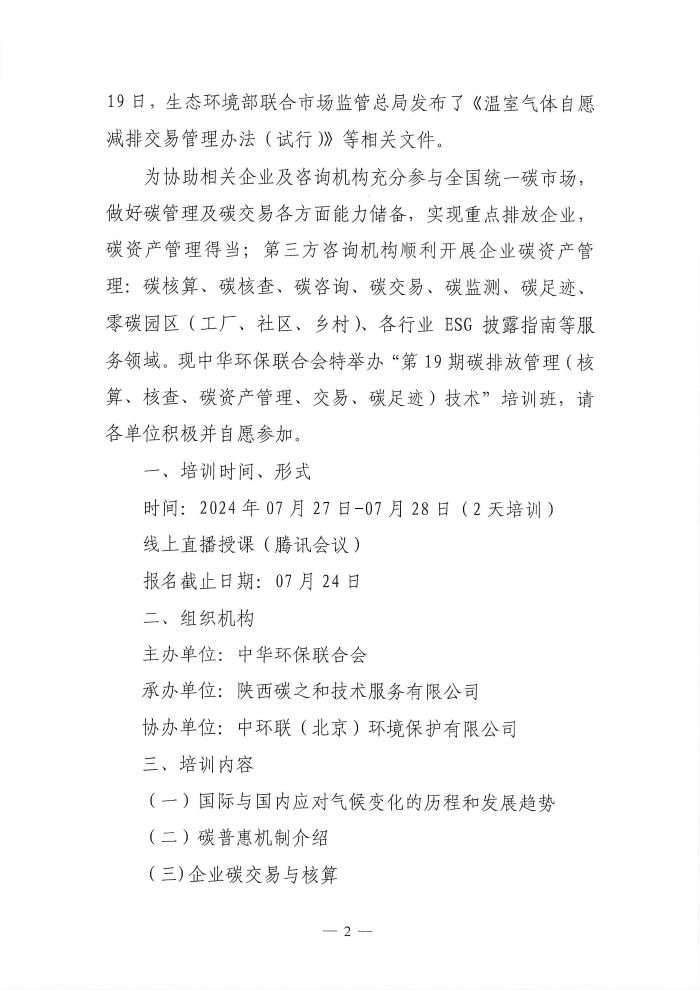 关于举办第19期“碳排放管理(核算、核查、碳资产管理、交易、碳足迹)技术培训班”的通知