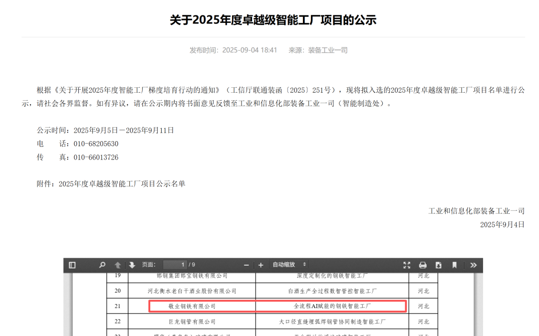 近年来,敬业集团积极响应国家“十四五”智能制造发展规划,依托工业互联网、人工智能等技术推动全流程改造,打造高科技智能化工厂。此次获选的敬业钢铁智能工厂以“全流程智能化改造、全要素数据打通、全链条绿色升级”为核心抓手,在生产作业、生产管理、运行管理等关键环节实现了22个数字化系统的“横向拉通、纵向穿透”,形成数据驱动的智能化运营体系。