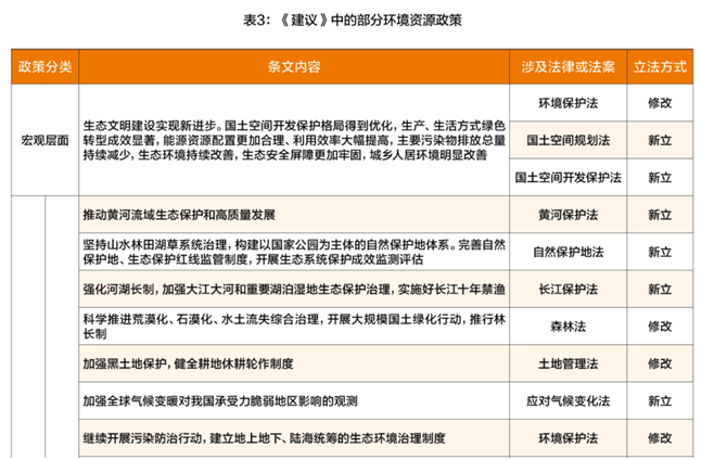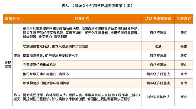 对《建议》中的环境资源政策进行梳理,我们可以发现,一方面有既往生态环境保护理念的梳理,如统筹推进经济建设、政治建设、文化建设、社会建设、生态文明建设的总体布局。另一方面也有很多新的政策提法,如推动黄河流域生态保护和高质量发展、构建以国家公园为主体的自然保护地体系、开展大规模国土绿化行动、加强黑土地保护,健全耕地休耕轮作制度、重视新污染物治理、形成国土空间开发保护新格局、建立资源价格形成机制、构建废旧物资循环利用体系等。