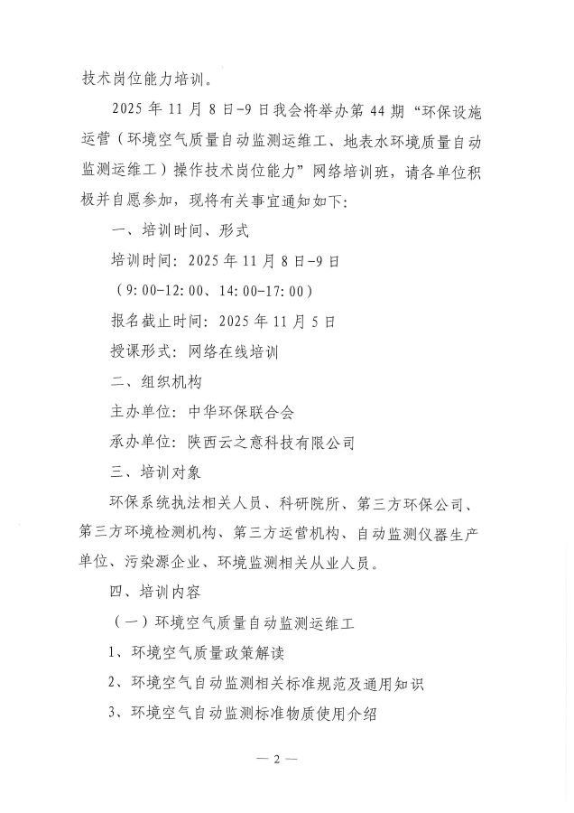 关于举办第44期“18luck新利苹果(环境空气质量自动监测运维工、地表水环境质量自动监测运维工)操作技术岗位能力”网络培训班的通知