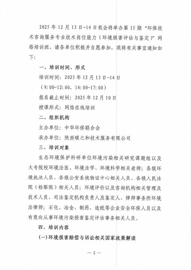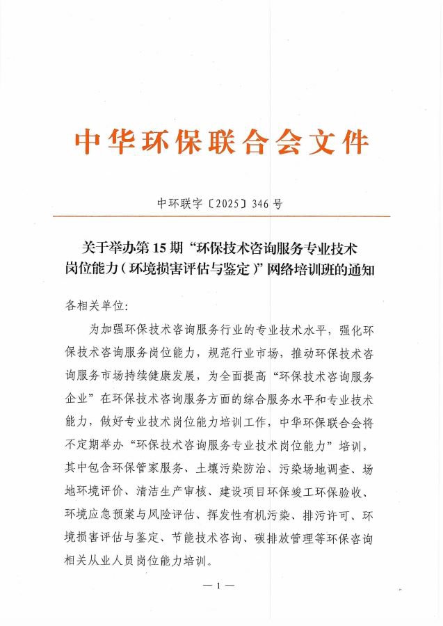 关于举办第15期“环保技术咨询服务专业技术岗位能力(环境损害评估与鉴定)”网络培训班的通知