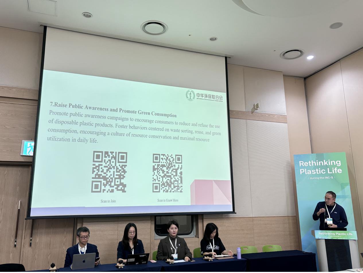The All-China Environment Federation (ACEF) followed the negotiation process at the venue and organized multiple events, systematically showcasing the experiences and cutting-edge practices of China's civil society in plastic pollution governance. Below is a summary of the related activities: ![]() On the afternoon of November 24th, 2024, the ACEF, SEE Foundation, Shenzhen Zero Waste , Green Recycled Plastic Supply Chain Joint Working Group (GRPG), and World Wildlife Fund (WWF) Beijing Office co-hosted the side event "United Action: Chinese NGOs Jointly Addressing Global Plastic Pollution" at the Westin Hotel in Busan. The Deputy Head of the Chinese Delegation to INC-5 and Deputy Director of the Department of Solid Waste and Chemicals, Ministry of Ecology and Environment, Wen Xuefeng, delivered the opening remarks. Representatives from China's industry, academia, and social organizations discussed in-depth with international counterparts, sharing cutting-edge experiences and innovative practices in plastic pollution governance. The event aimed to gather the strength of various stakeholders from China and abroad to inject innovative ideas and solutions into global plastic pollution governance and facilitate substantial progress in the negotiation process of the international instrument. For more details on the side event, please visit: [Link to the Side Event Details](https://caijing.chinadaily.com.cn/a/202411/27/WS6746b61da310b59111da5c2e.html) ![]() On the second day of the INC-5 negotiations, the ACEF, in collaboration with the SEE Foundation, Shenzhen Zero Waste, and other Chinese civil organizations, organized a side event on the theme "Local Actions, Global Impact: Chinese NGOs' Solutions and Experiences in Addressing Plastic Pollution" in the official side event room of INC-5. They shared case studies and showcased initiatives related to the INC-5 joint initiative of Chinese civil organizations, public advocacy, e-commerce detoxification, new plastic pollution, and essential elements of the plastic convention, engaging in dialogue and exchange with international guests through a Q&A session. ![]() On the 27th, the ACEF, GRPG, Foreign Economic Cooperation Office of the Ministry of Ecology and Environment (FECO), and Tsinghua Suzhou Institute of Environmental Innovation co-hosted the official INC-5 side event "Shaping the Future of Plastic Value Chains: Industrial and Commercial Circular Pathways." Representatives from China's National Development and Reform Commission, Ministry of Industry and Information Technology, and Ministry of Ecology and Environment, along with global industry, academia, and international organizations, discussed innovative solutions for plastic pollution governance, especially sustainable and feasible circular pathways in industry and commerce. The event systematically showcased the practices and achievements of China's plastic industry chain in pollution prevention and control and the circular economy, contributing Chinese wisdom to the negotiations on the plastic convention. For more details on the side event, please visit: [Link to the Side Event Details](https://res.cenews.com.cn/h5/news.html?id=1178975) ![]() During the conference, the ACEF, in partnership with the SEE Foundation, Shenzhen Zero Waste, and GRPG, launched the INC-5 Plastic Pollution Governance Action Initiative at the venue. The initiative, centered around a convention content that is "ambitious yet pragmatic and balanced," basic research and data tracking, and the elimination and restriction of problematic plastic products, formed seven倡议 items. These were displayed for a week on the second floor of the negotiation venue, with representatives from various countries' negotiation teams and civil organizations participating in on-site interactions and co-signing the initiative. For more details on the initiative, please visit: [Link to the Initiative Details](https://active.clewm.net/DxCPSm?qrurl) ![]() Representatives of the federation also continuously followed the INC-5 negotiation process, discussing and analyzing key negotiation issues such as plastic products, sustainable production, and financial mechanisms with representatives from the United States, Argentina, Switzerland, Kenya, Bangladesh, and other regional and national representatives. They offered suggestions, viewpoints, and shared China's experiences in plastic pollution governance, assisting the convention negotiation process from the perspective of civil organizations. The related content received attention from institutions and media such as the International Institute for Sustainable Development (IISD) and Associated Press. By the closing of the conference, the activities hosted by the federation were reported by more than 40 well-known media outlets. |