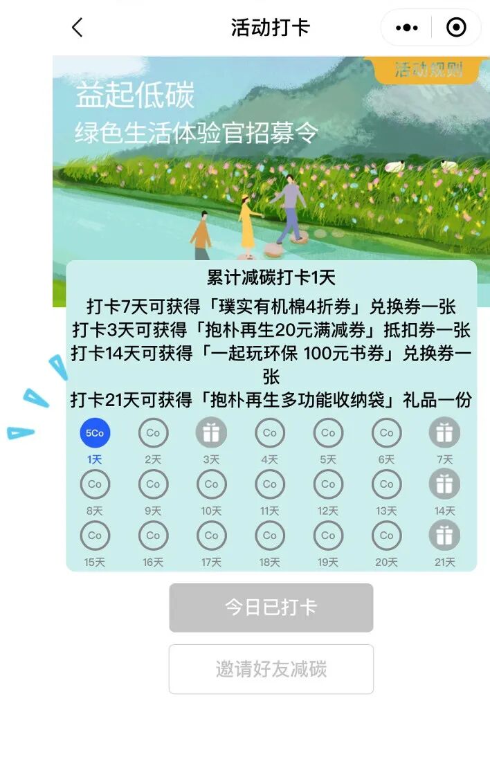 成功完成连续21天打卡的朋友,还将获得纪念证书一份。累计专属于你自己的减碳数据,从更科学的角度审视自己的生活方式,成为真正的“零碳达人”!