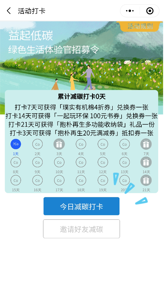 累计打卡14天,可得《一起玩环保》桌游书100元代金券;